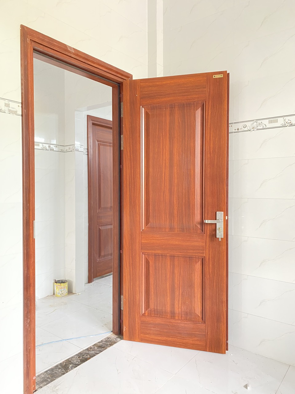 - Cuối cùng, cửa được phủ một lớp sơn để tạo độ bóng cho vân gỗ, tạo ra một màu đồng nhất cho toàn bộ cánh cửa giống y như màu gỗ thật.
